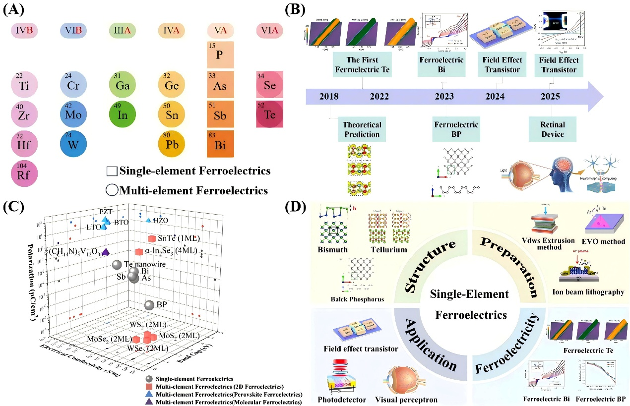 本综述系统阐明了单元素铁电体的三大形成机制、一维纳米线与二维纳米片的关键制备方法,以及三种典型单元素铁电材料的晶体结构与铁电压电特性,重点凸显其在晶体管、非易失性存储器、光电探测器及光电突触忆阻器中的应用优势。该综述不仅为单元素铁电体的基础研究提供了统一理论框架,也为其实现低功耗电子器件、量子信息存储和神经网络等实际应用奠定了重要基础。